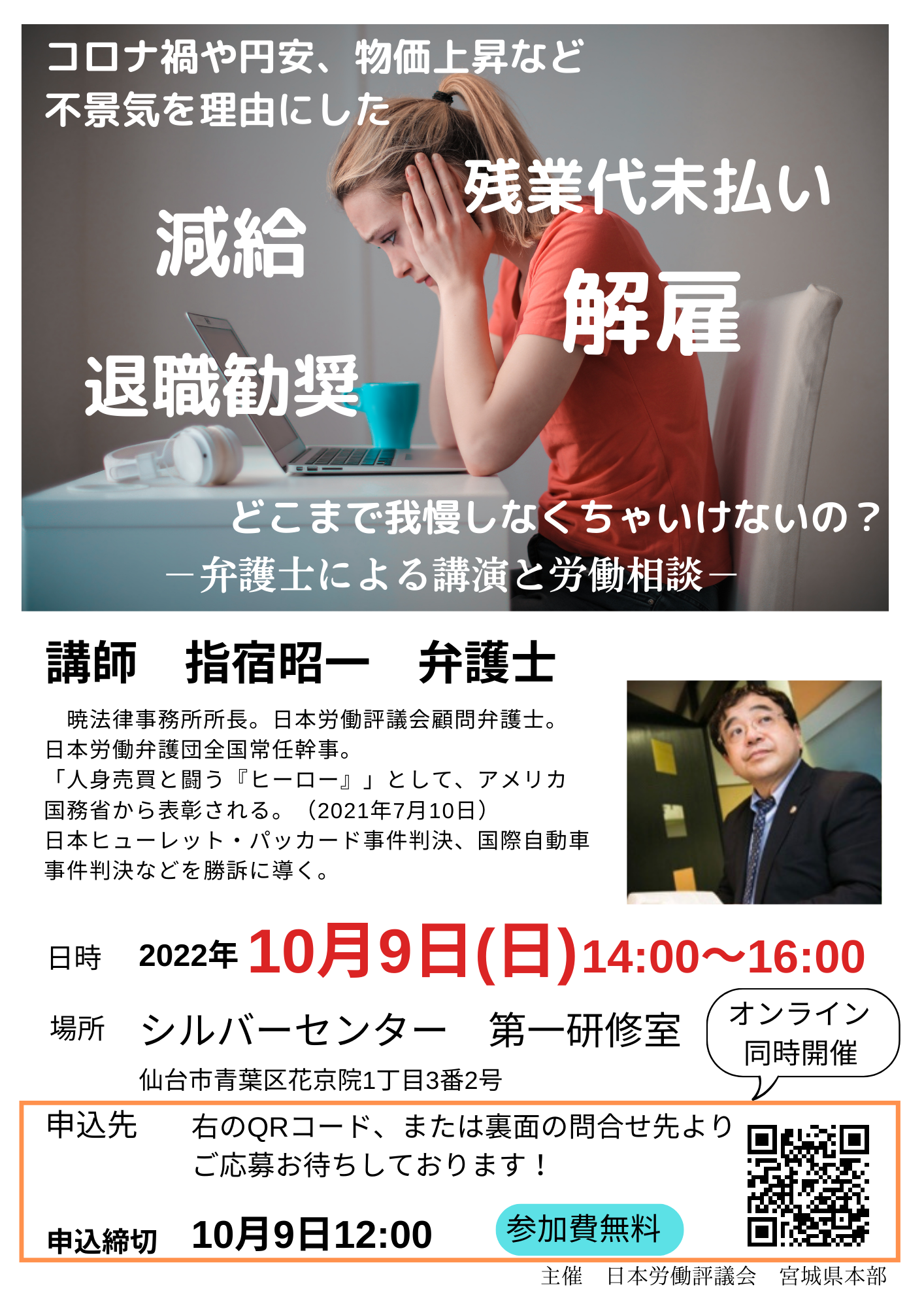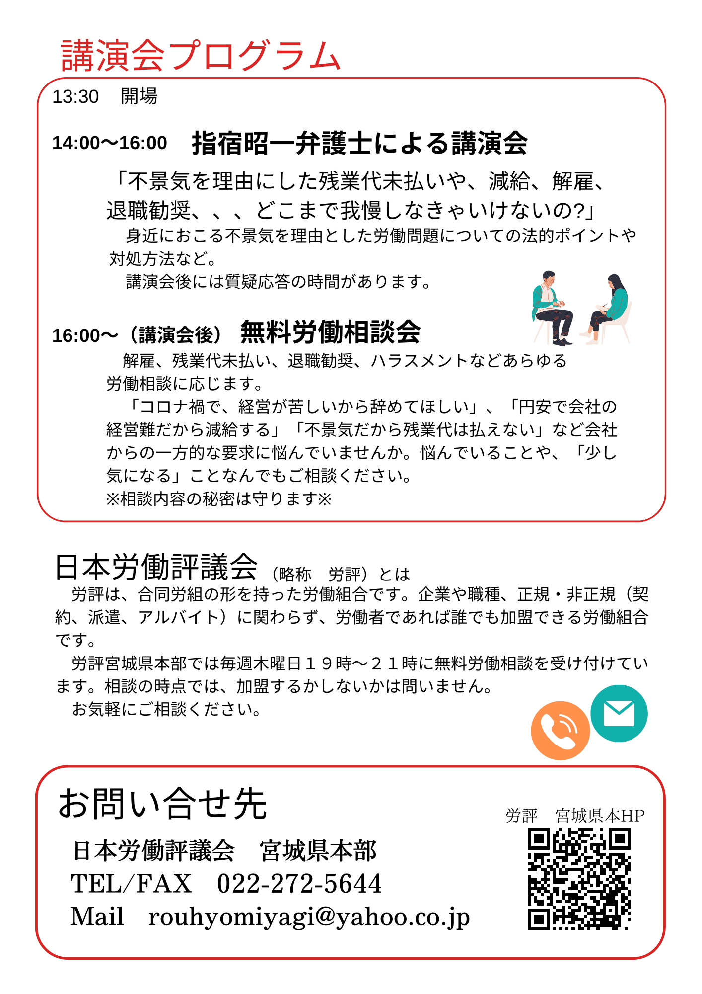 また、日本労働評議会 宮城県本部は、随時労働相談を受け付けております。いつでもお気軽にご連絡ください。