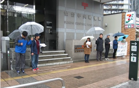 今朝は、仙台中央郵便局にてビラまきを行いました。